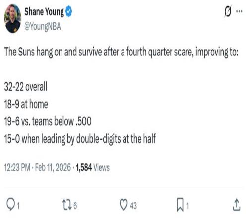 拿下胜利后太阳队战绩提升至32胜22负,继续占据西部第七的同时,将落后身前西部第5湖人与第6名森林狼之间的差距缩小到0.5个胜场,再度向西部前六发起冲击。